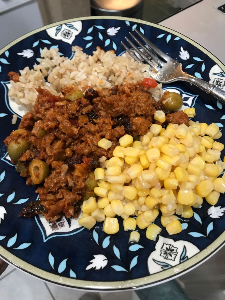 Picadillo will always remind me of meals at home around the dinner table. The funny thing about picadillo is that it always tastes completely different depending on the person who makes it. Some people make it with more tomato sauce, so it looks bright red, and some people don’t like it with olives or raisins. Even though this recipe is different from my mother’s, my grandmother’s, or even the ones found in La Carreta in Miami, I found a way to make this one mine: vegetarian, sweet with raisins, and salty with olives!